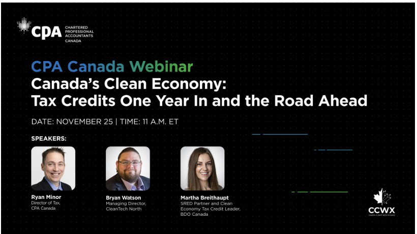 CPAC is hosting a webinar on November 25, 2025 from 11:00am to 12:30pm EST titled "Canada's Clean Economy: Tax Credits One Year In and the Road Ahead". Our objective is to educate viewers on the basics of the four credits that exist (and proposed amendments) including practical advice for filing claims. We will also discuss challenges with these credits including using the credits as collateral for financing. We will also touch on developments in the US (Inflation Reduction Act).